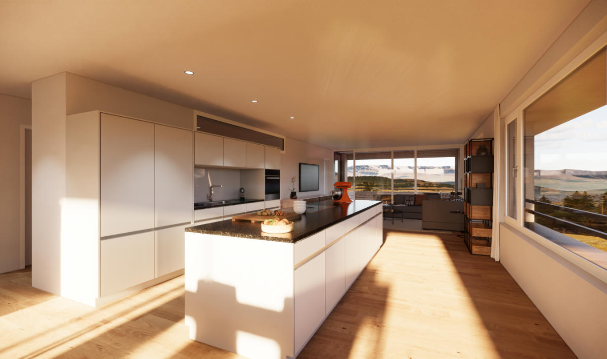 Visualisierung einer Dachwohnung – Wohnen, Küche mit Essbereich